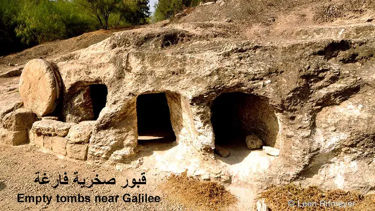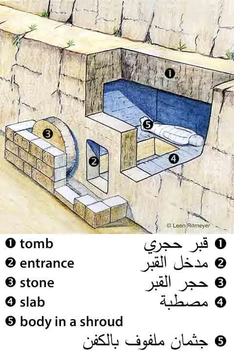 At the time of the Messiah, most tombs were caves that people had dug out of the rock of a hillside. Each tomb had an entrance that was opened or closed with a large rolling stone, shaped like a wheel. Most of these tombs could hold several bodies, placed there at different times, each in its own place. A year or so later, people would put the bones in a small container. Today, most people bury the dead in holes dug in the ground and cover them with dirt. In English, these holes are called "graves."